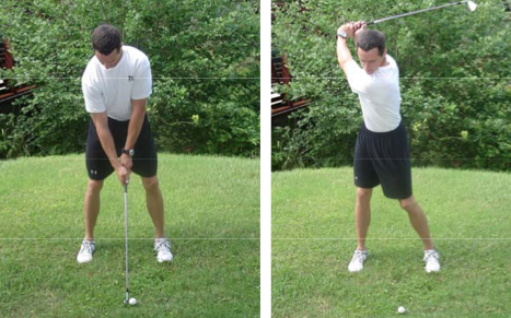 Swing issues/body compromises: Inability to rotate the shoulders relative to the hips and hips relative to the legs causes the right knee to extend and the left heel to lift off the ground. This unloads the abdominals and gluteal muscles, robbing the body of the ability to store potential energy. Consequently, the player becomes overreliant on his shoulders and arms to initiate the swing and create clubhead speed. The elbows and shoulders take the brunt of the abuse.