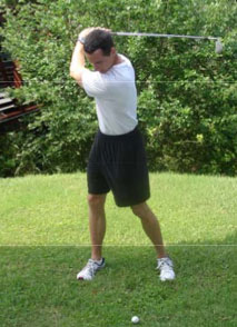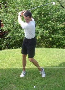 Swing issues/body compromises: Inability to rotate the shoulders relative to the hips and hips relative to the legs causes the right knee to extend and the left heel to lift off the ground. This unloads the abdominals and gluteal muscles, robbing the body of the ability to store potential energy. Consequently, the player becomes overreliant on his shoulders and arms to initiate the swing and create clubhead speed. The elbows and shoulders take the brunt of the abuse.